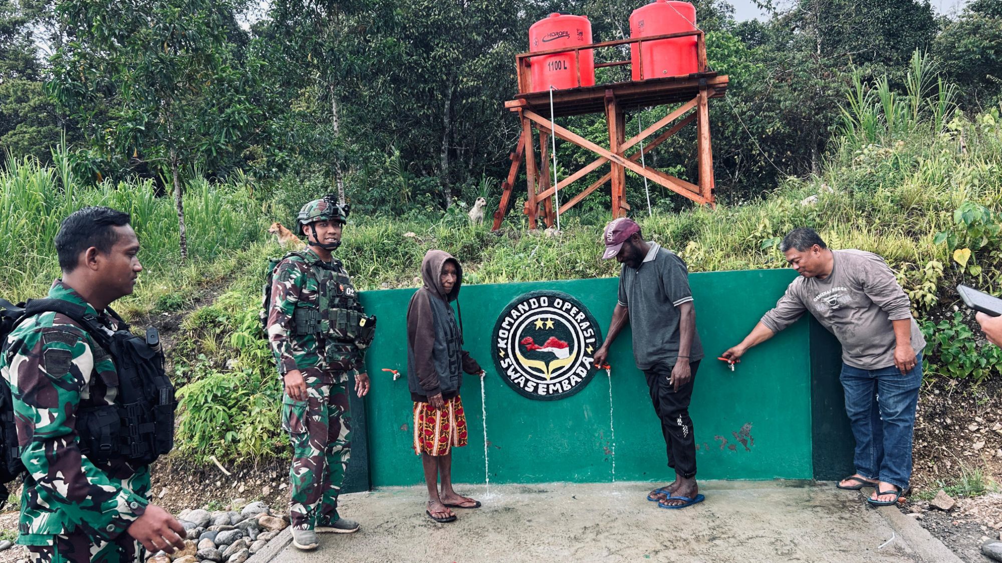 Global Cyber News.Com. -Kampung Kutdol, Pegunungan Bintang — TNI melalui Program TNI Manunggal Air membangun dan menyerahkan penampungan air bersih bagi warga Kampung Kutdol, sebagai solusi keterbatasan akses air terutama pada musim kemarau. Program ini menyasar kampung-kampung di sekitar Pos Okpol yang kerap terkendala pasokan air, agar kebutuhan harian—mulai dari konsumsi, kebersihan, hingga sanitasi—lebih terjamin.(Senin,24/11/2025).