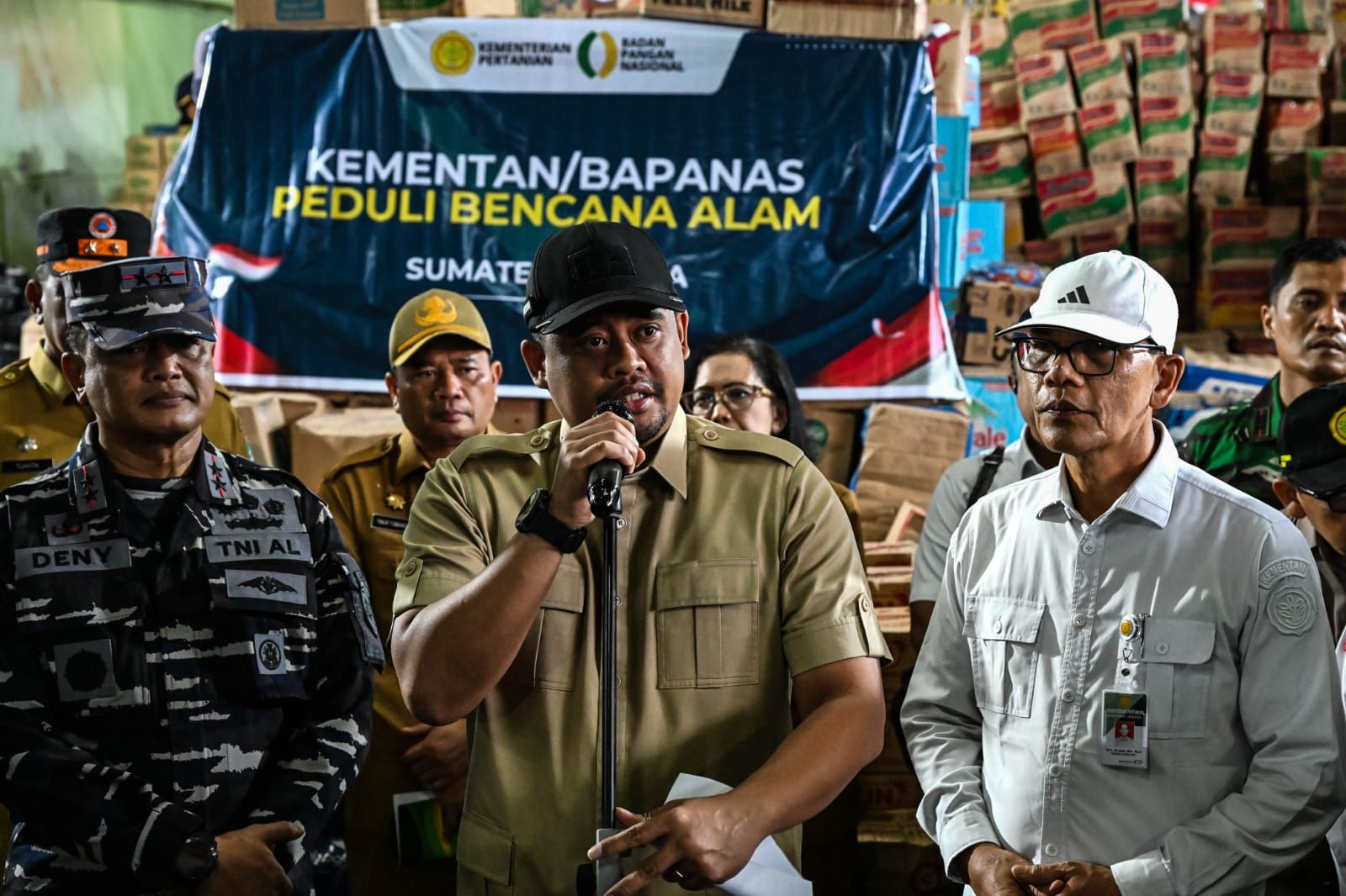 Bantuan secara simbolis diserahkan oleh Staf Ahli Bidang Infrastruktur Pertanian Kementan Ali Jamil kepada Gubernur Bobby Nasution di atas KRI Banda Aceh 593-1. Sebanyak 25 truk disiapkan untuk mengangkut bantuan logistik berupa sosis, mi instan, minyak goreng, susu, gula, pampers, pembalut, air mineral, beras, biskuit, sarung, teh, sandal, sabun, odol dan sikat gigi, kopi, pakaian, hingga selimut.