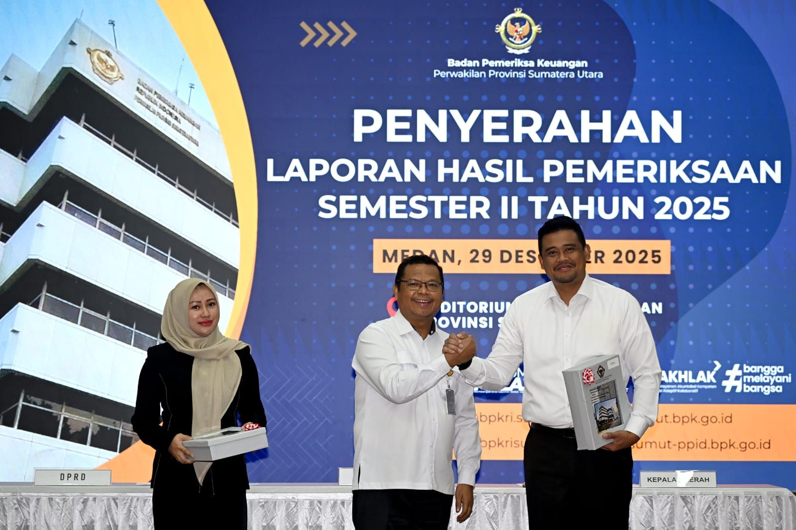 Hal ini disampaikan Bobby Nasution saat menghadiri acara Penyerahan Laporan Hasil Pemeriksaan (LHP) Kepatuhan atas Kegiatan Peningkatan Sarana dan Prasarana Pendidikan di Pemprov Sumut dan instansi terkait lainnya, Tahun 2024 sampai Semester II Tahun 2025 yang digelar di Auditorium BPK Perwakilan Provinsi Sumut, Jalan Imam Bonjol, Medan, Senin (29/12/2025).