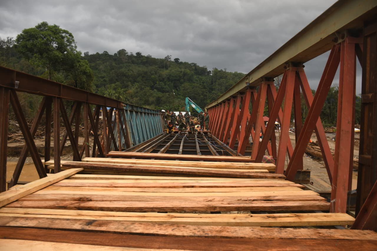 Sampai hari ini, progres pemasangan Jembatan Bailey telah mencapai 85 persen. Meski sempat terkendala kondisi cuaca hujan, prajurit Yonzipur I/BB tetap mengoptimalkan pekerjaan agar penyelesaian jembatan dapat dilakukan sesuai target yang telah ditetapkan.