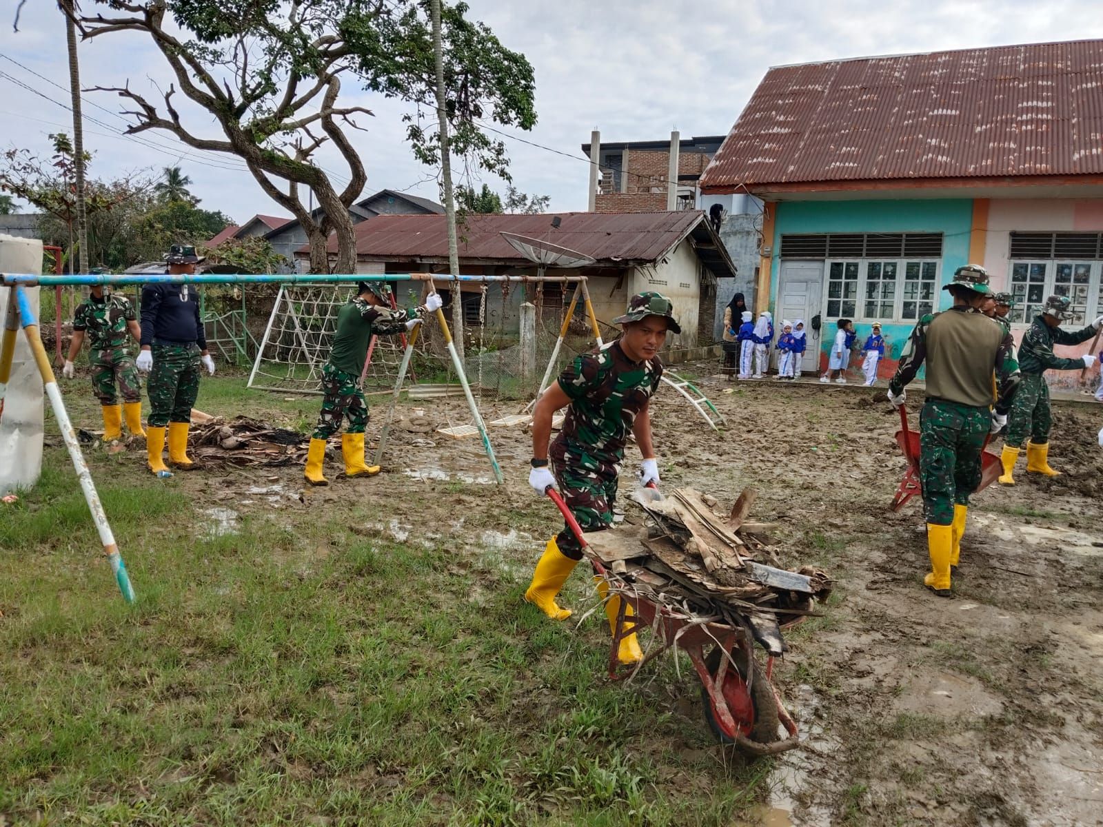 Karya bakti difokuskan pada pembersihan lumpur, sampah kayu, serta sisa material banjir yang menutupi halaman dan area bermain anak-anak. Berdasarkan pantauan di lapangan, personel TNI terlihat bekerja secara gotong royong menggunakan alat sederhana seperti sekop dan gerobak dorong untuk mengangkut material sisa banjir agar lingkungan sekolah kembali bersih dan aman.
