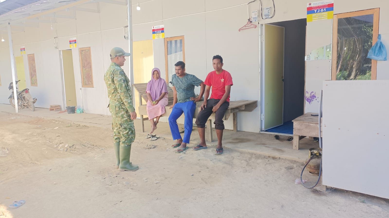 Di sela langkahnya menyusuri lingkungan huntara, Sertu Andre menyempatkan diri menyapa warga yang tengah duduk santai di depan halaman. Sapaan sederhana berubah menjadi obrolan ringan yang penuh keakraban, membahas keseharian hingga kondisi tempat tinggal mereka.