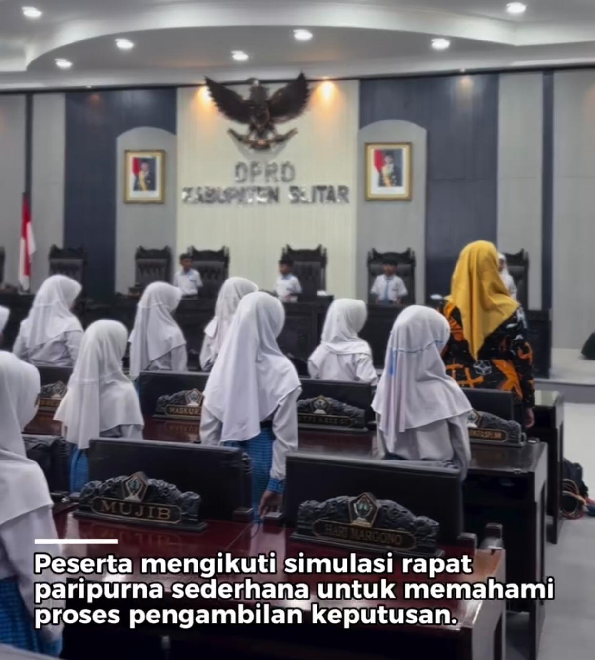 Untuk menambah pengalaman belajar, kegiatan dikemas secara interaktif melalui simulasi rapat paripurna sederhana. Dalam simulasi ini, siswa diperkenalkan dengan tata cara persidangan, mulai dari pembukaan rapat, penyampaian pendapat, hingga proses pengambilan keputusan secara sederhana. Hal ini bertujuan agar para siswa dapat memahami secara langsung mekanisme kerja DPRD.