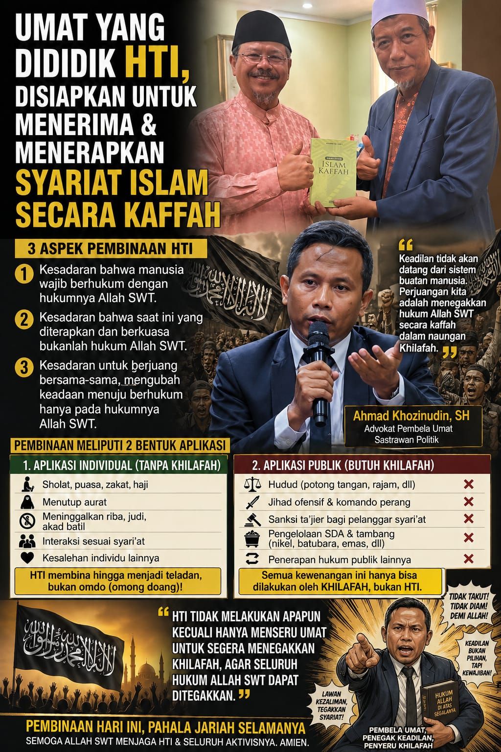 Dalam konteks pembinaan ini, sudah begitu banyak bagian dari umat ini yang dibina HTI, yang tadinya tidak sholat menjadi rajin sholat. Yang tadinya puasa bolong bolong, menjadi penuh. Meninggalkan riba, menutup aurat, menjaga interaksi, dan berbagai kesalehan individual lainnya.